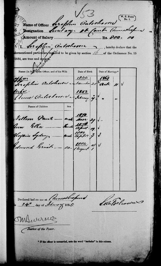 My next bit of information came from the Ceylon Widow & Orphans Fund. The Cairns Family History Center has indexed all these applications into a database, and individual records can be purchased for a small fee. I saw an application made by Annie’s husband Seraphim Outschoon, to join the fund. The application mentions that Annie was born on February 7th 1852. The newspaper mentions the birth date to be February 17th and not February 7th. So does this mean that Annie is not the daughter of Robert? Absolutely not! An error of margin in recording dates is expected! Typically I use the rule of thumb that a recorded date could have a margin of error or about a year. Both of these birth dates occurred in February and has a 7 on the date. So there could have been a simple transcription error. Nevertheless, I still did not conclude that Annie was the daughter of Robert.