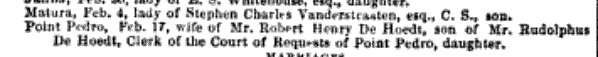 The above clipping is from the newspaper The Indian News and Chronicle of Eastern Affaires from 1852. What an elegant and old-fashioned title! Anyway, the clipping mentions Robert Henry De Hoedt, who was the son of Rudolphus De Hoedt, who had a daughter born on February 17th.