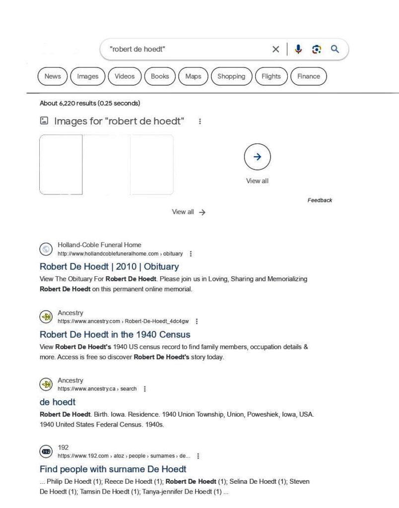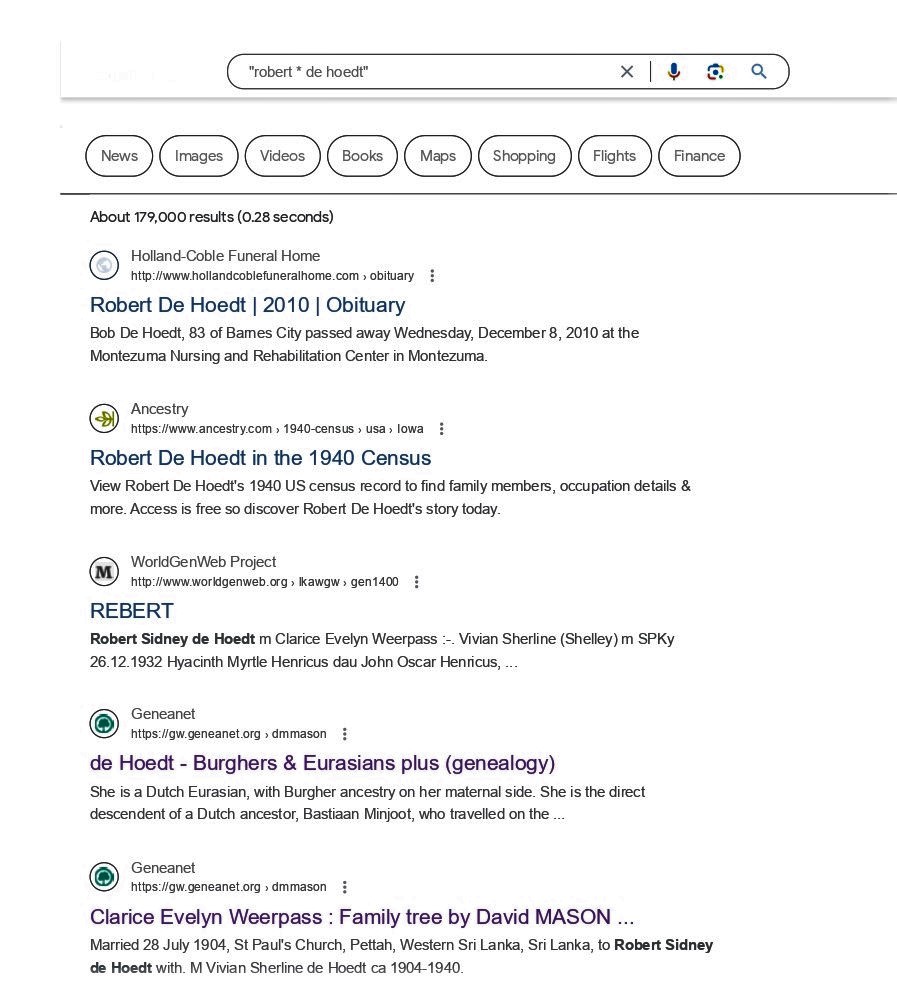 An asterisk (*) serves as a wildcard and can replace any word or phrase. This symbol is useful when you’re unsure about specific details. For example, “robert* de hoedt” will yield results for robert sidney de hoedt, robert james de hoedt, robert de hoedt etc.