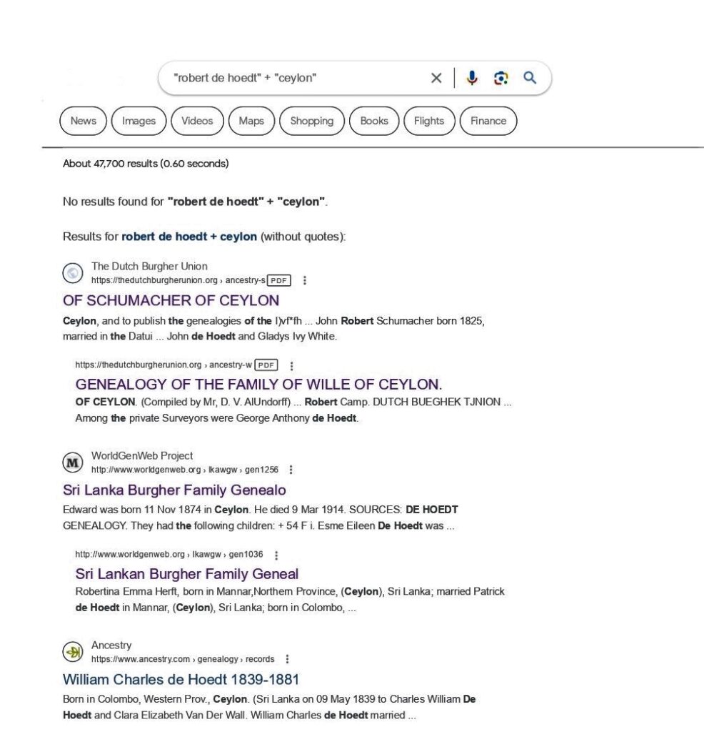 Google Books is a repository of millions of books, some of which might mention your ancestors. Go to the Google Books homepage and enter your ancestor’s name in quotes. You can filter the results by date to narrow down your search. Furthermore, I narrow down the search by additionally providing words such as “ceylon” along with the names I’m searching for. So for example when I was researching the De Hoedt family that lived in Jaffna, my search would be: “de hoedt” + “jaffna” and then I would adjust the time period as desired. Be mindful that sometimes ancestor’s names would have spelling variations. For example, if I was searching for a person by the name of Annie Barbara De Hoedt, I would search using the following queries: “annie barbara de hoedt”, “annie de hoedt, “a.b de hoedt”, “a. de hoedt”, “anne de hoedt”, “anne barbara de hoedt” etc.