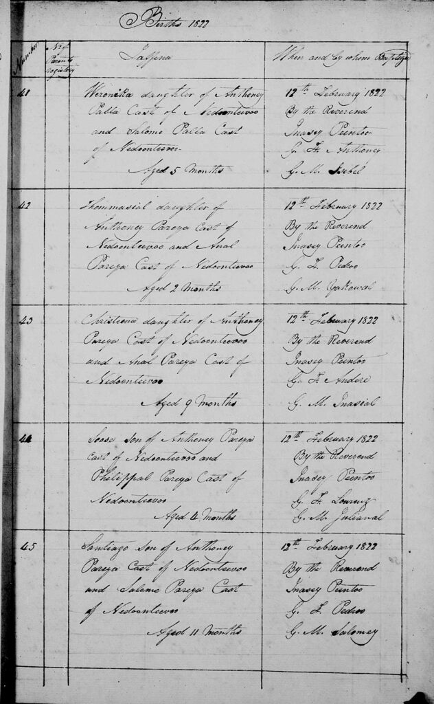 I call this the Dutch register format because it resembles the format used by the Dutch reformed church. Multiple records are written down on a single page with columns used to separate different bits of information. In my experience, this type of format seems to be most common with Roman Catholic and Wesleyan church records between 1822-1867.
